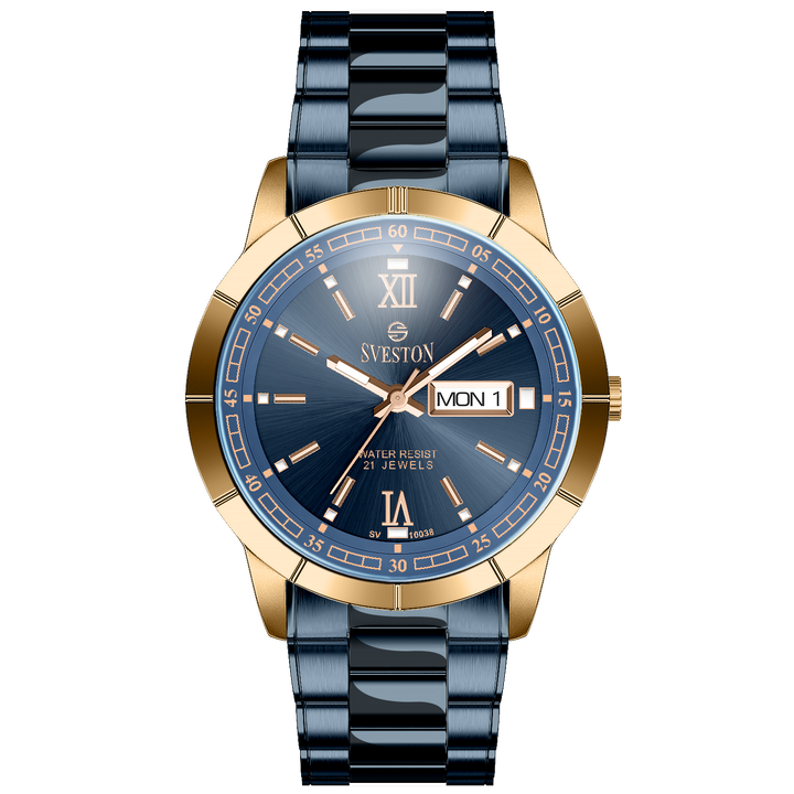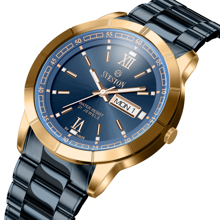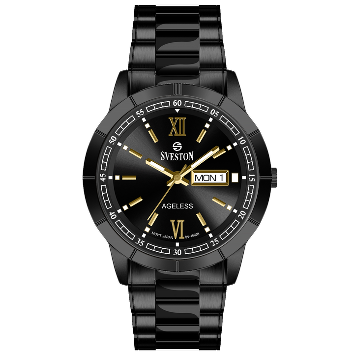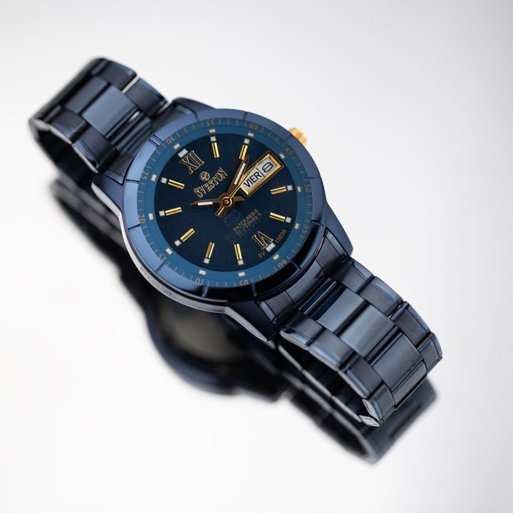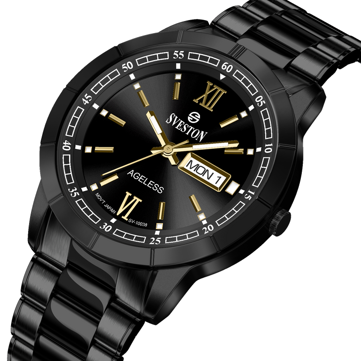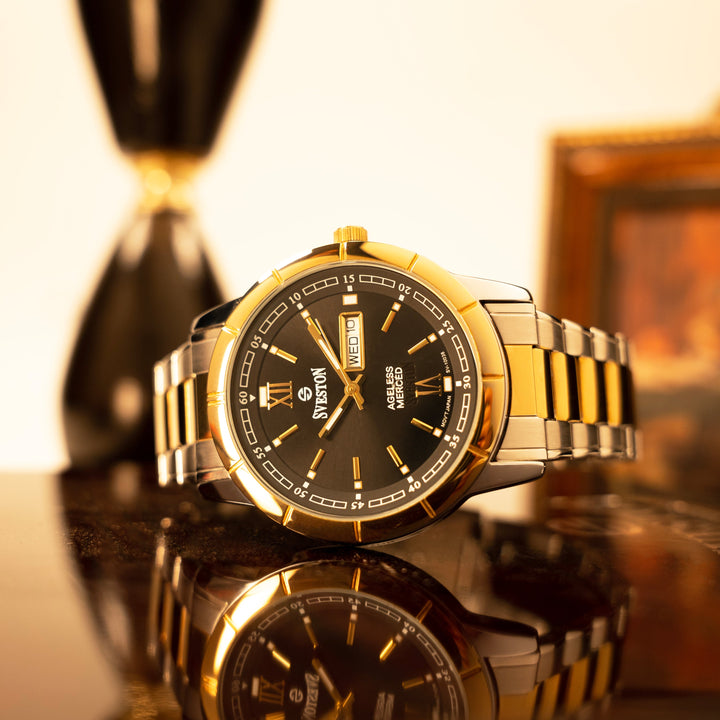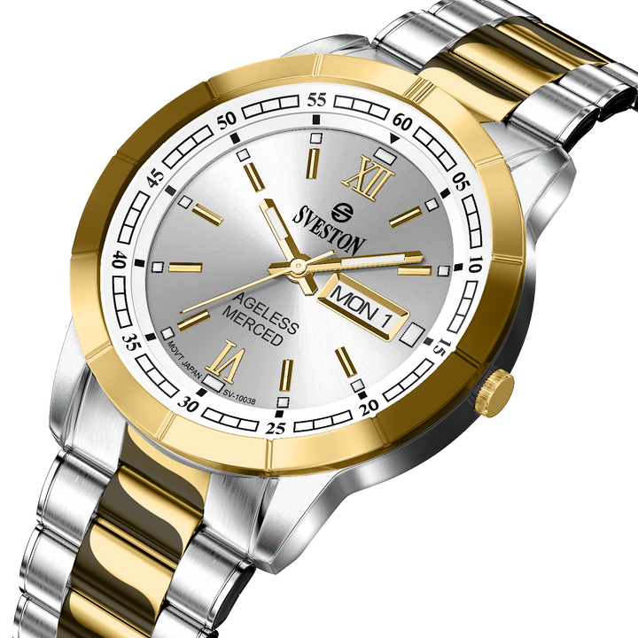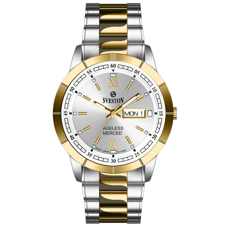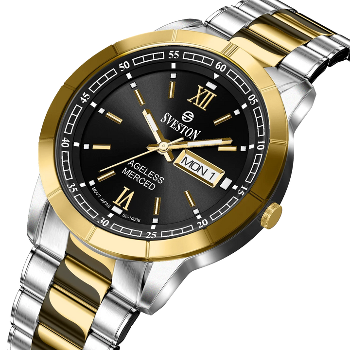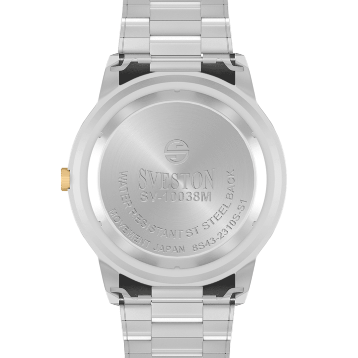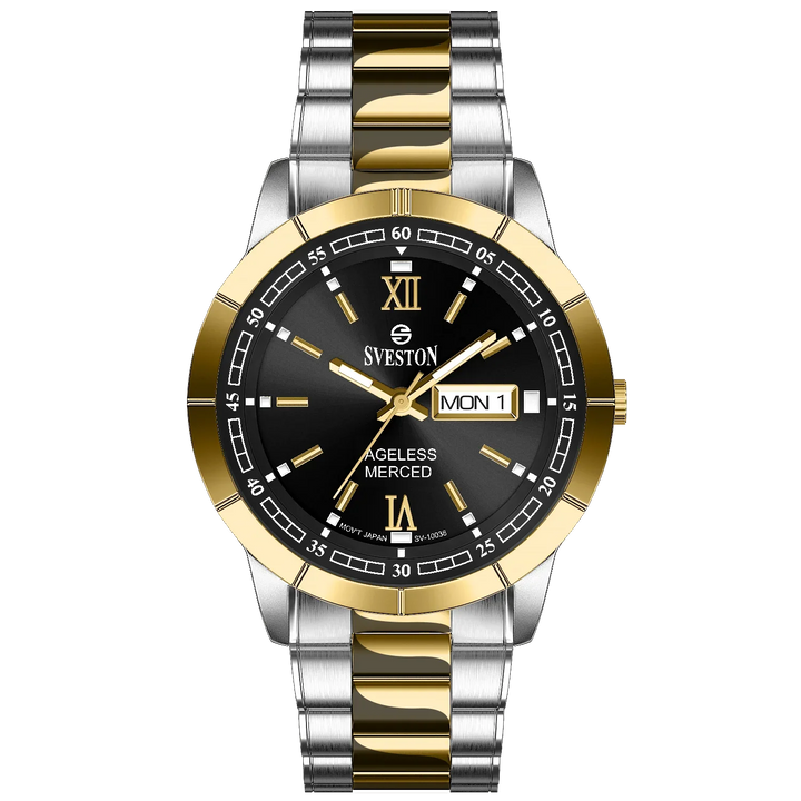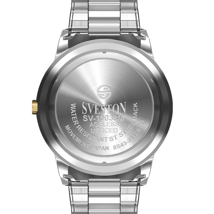 Sveston Ageless Merced is an elegant analog gents’ wristwatch powered by a precise Japanese quartz movement. It features a 38 mm stainless-steel round case with a push-button deployment clasp. The watch includes hour, minute, small-seconds, and date functions, all protected by a hardened mineral crystal. It comes in a signature Sveston box and is backed by a 1-year international warranty.