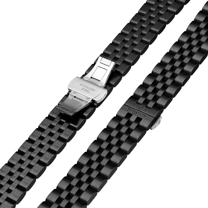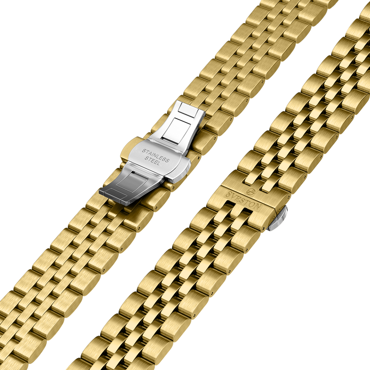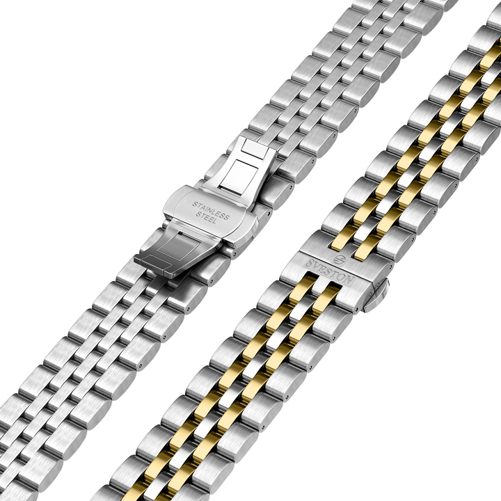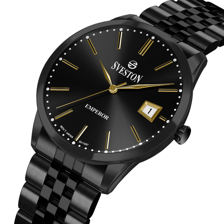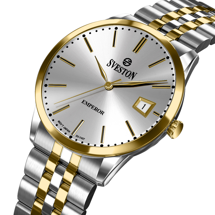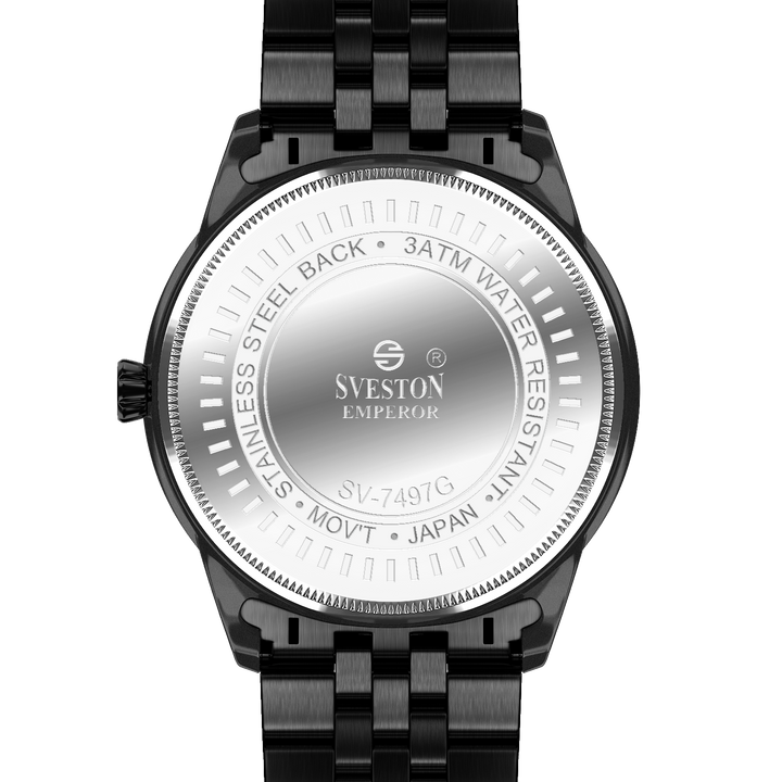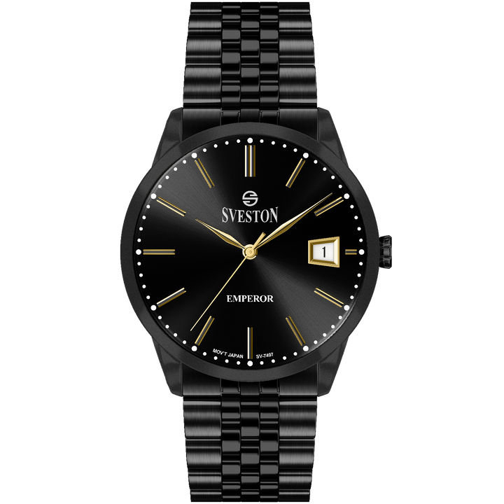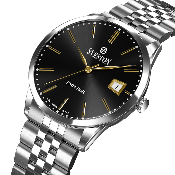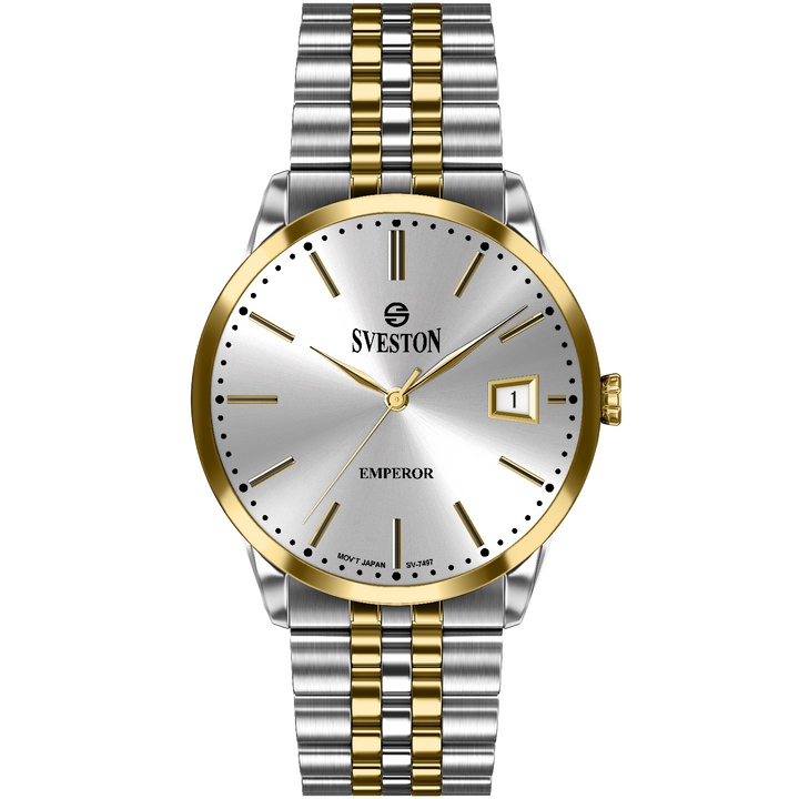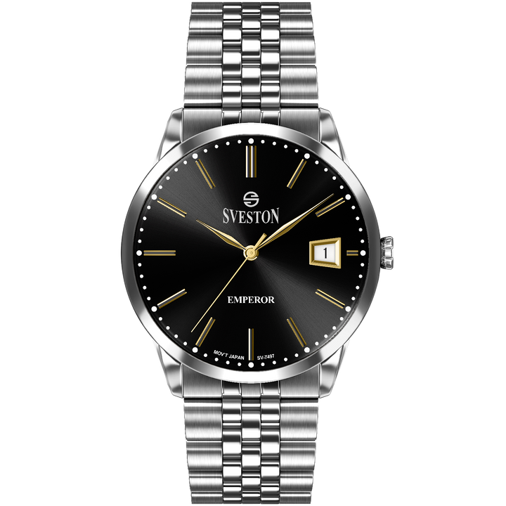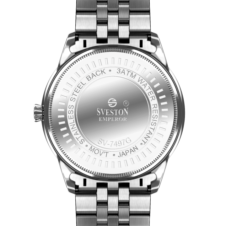 Sveston Emperor is a Female Battery-Powered 3-Hand Wrist Watch showcases a sophisticated design with a 28mm round case, complemented by a Link Stainless Steel featuring a Pushbutton Deployment Clasp. It offers essential functionalities including hours, minutes, small seconds, and a date window positioned on the right side. This elegant timepiece comes packaged in a luxury box and includes a 1-year international warranty for added assurance.