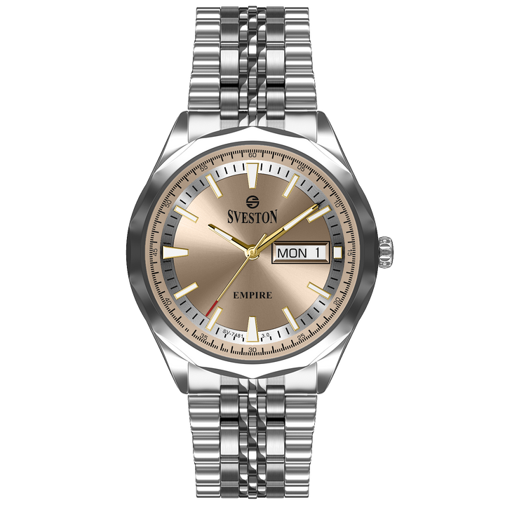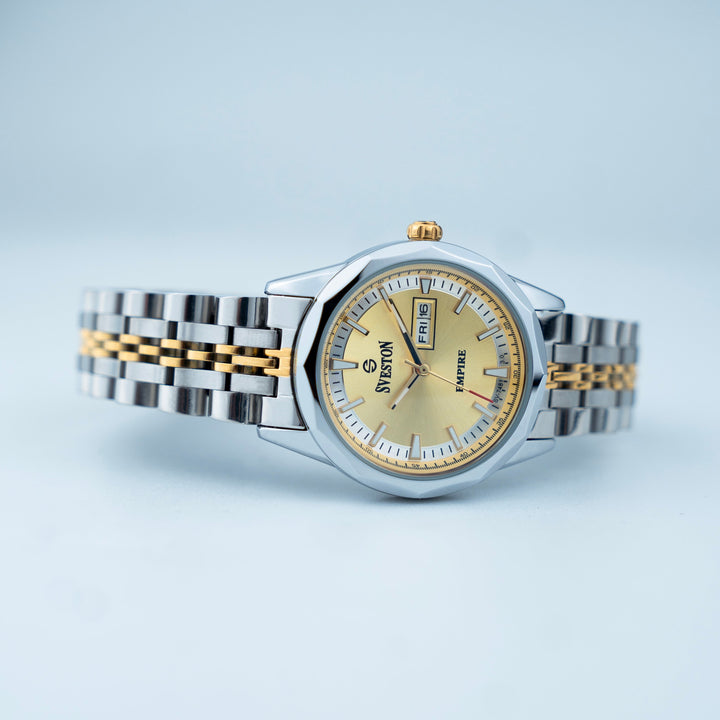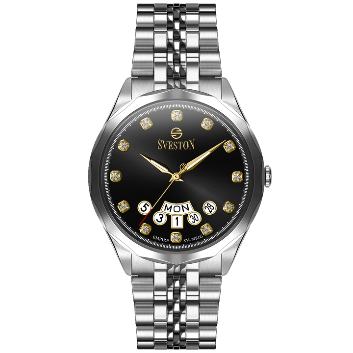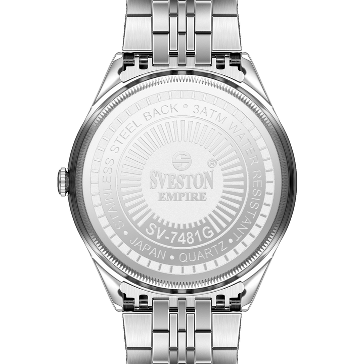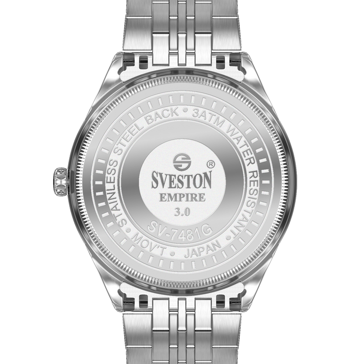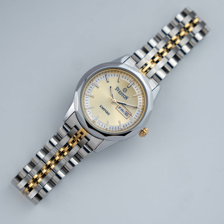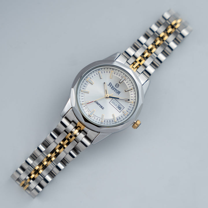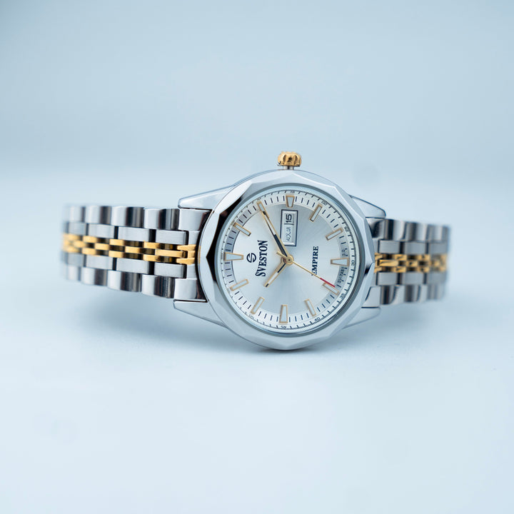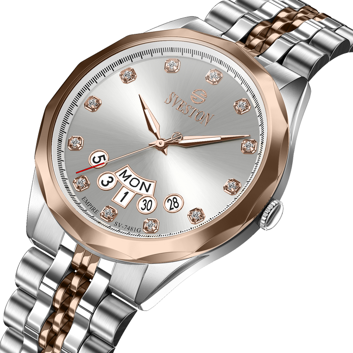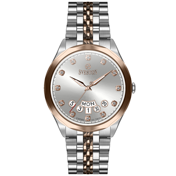 Sveston Empire is a Female Battery-Powered 3-Hand Wrist Watch showcases a sophisticated design with a 28mm round case, complemented by a Link Stainless Steel featuring a Butterfly Deployment Clasp It offers essential functionalities including hours minutes small seconds and a date window positioned on the right side this elegant timepiece comes packaged in a luxury box and includes a 1-year international warranty for added assurance