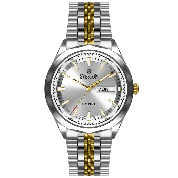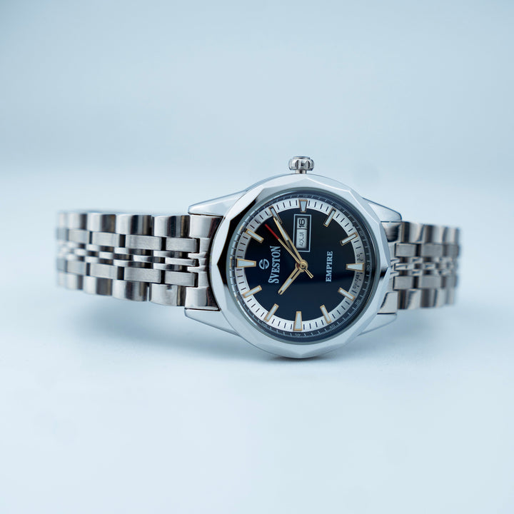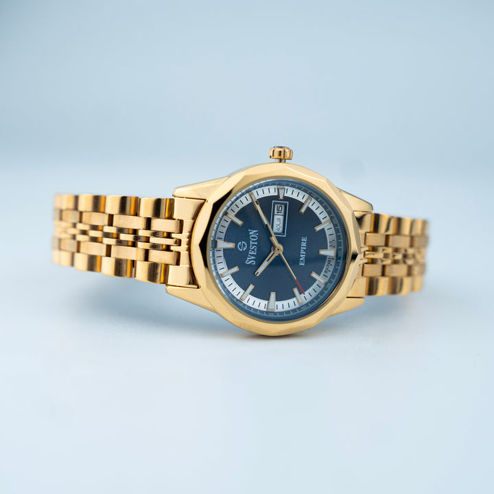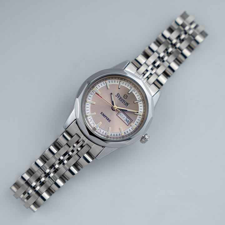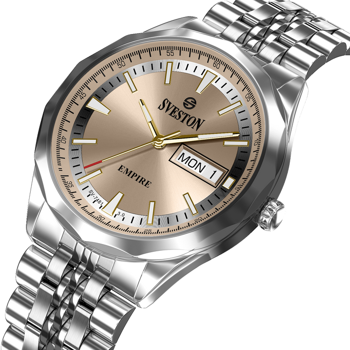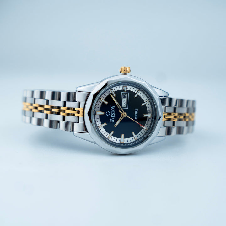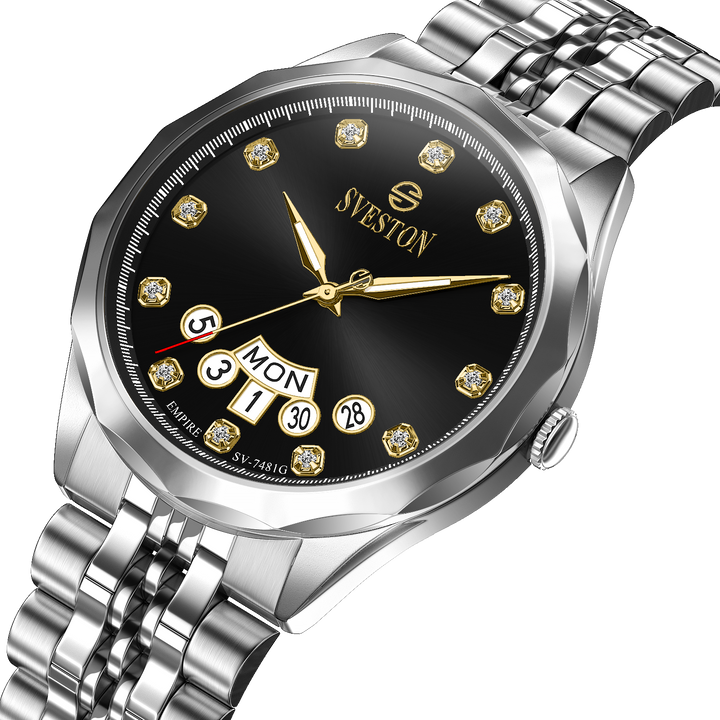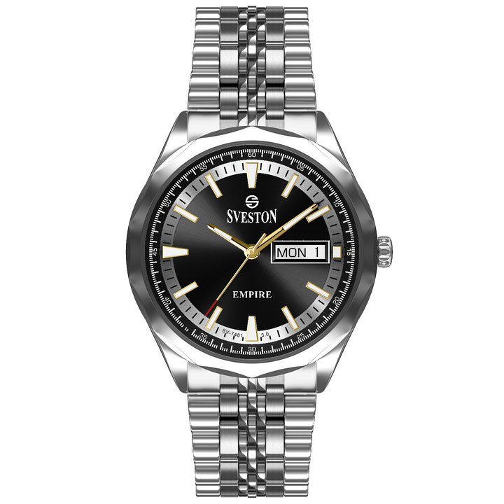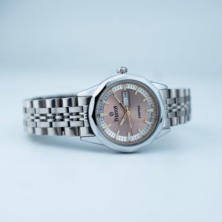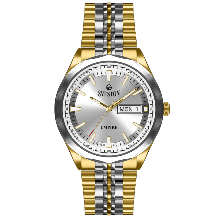 Sveston Empire is a Female Battery-Powered 3-Hand Wrist Watch showcases a sophisticated design with a 28mm round case, complemented by a Link Stainless Steel featuring a Butterfly Deployment Clasp It offers essential functionalities including hours minutes small seconds and a date window positioned on the right side this elegant timepiece comes packaged in a luxury box and includes a 1-year international warranty for added assurance