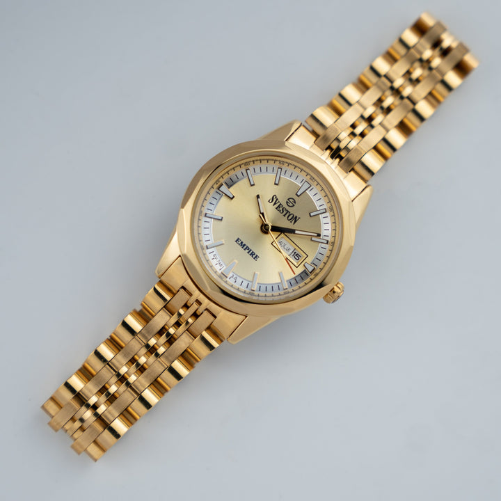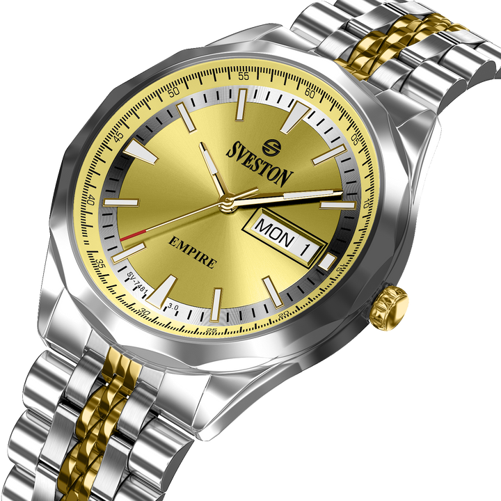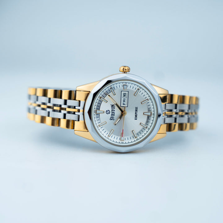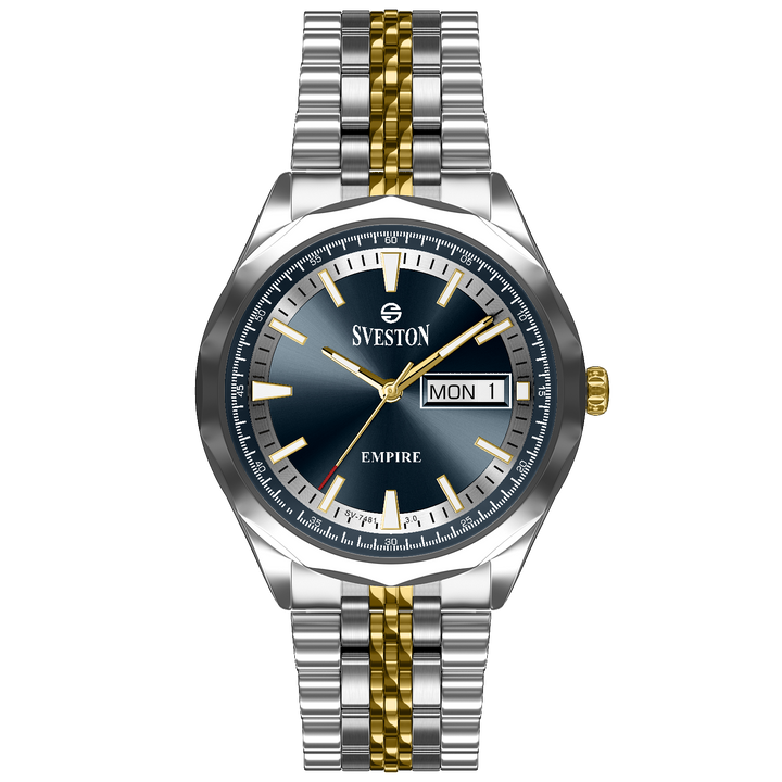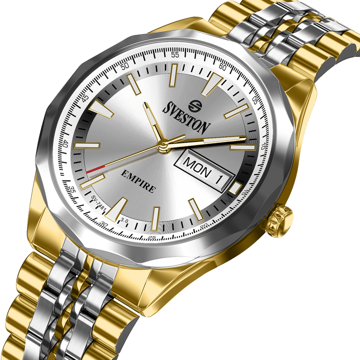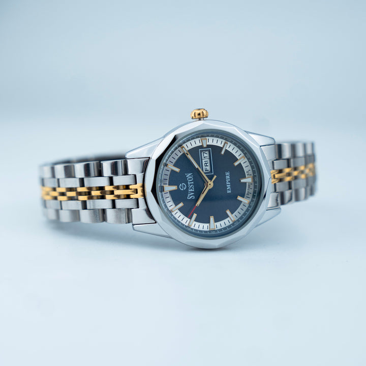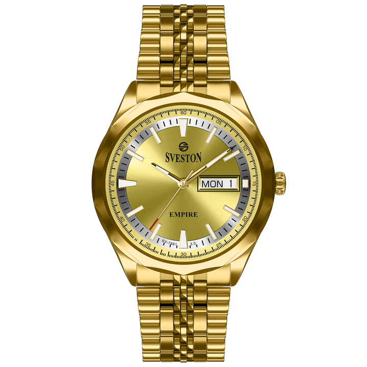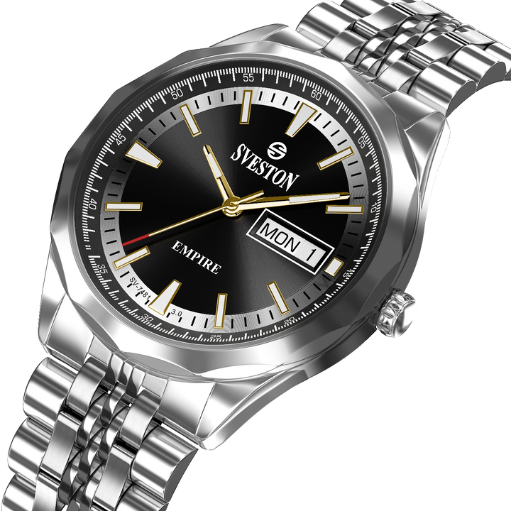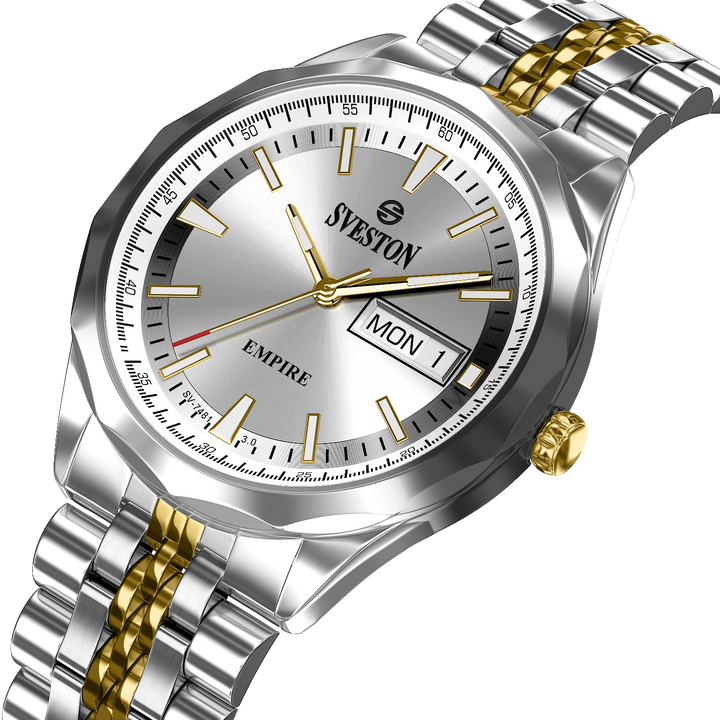 Sveston Empire is a Female Battery-Powered 3-Hand Wrist Watch showcases a sophisticated design with a 28mm round case, complemented by a Link Stainless Steel featuring a Butterfly Deployment Clasp It offers essential functionalities including hours minutes small seconds and a date window positioned on the right side this elegant timepiece comes packaged in a luxury box and includes a 1-year international warranty for added assurance