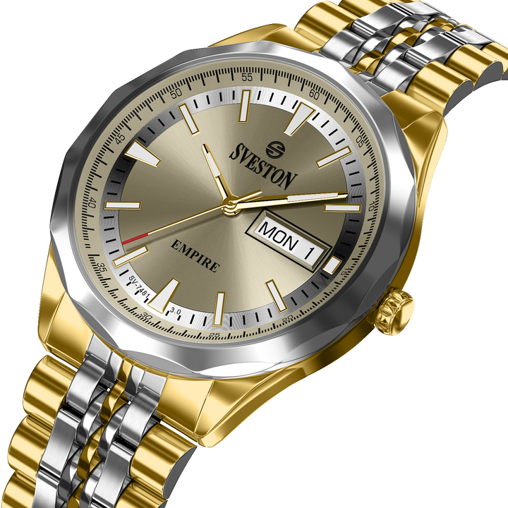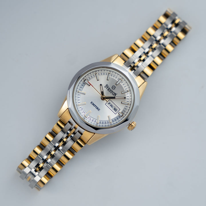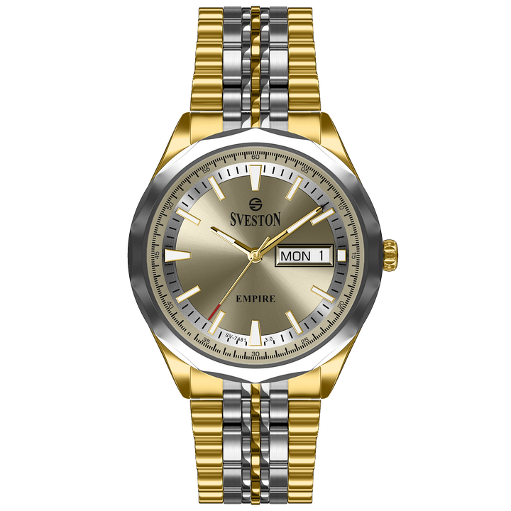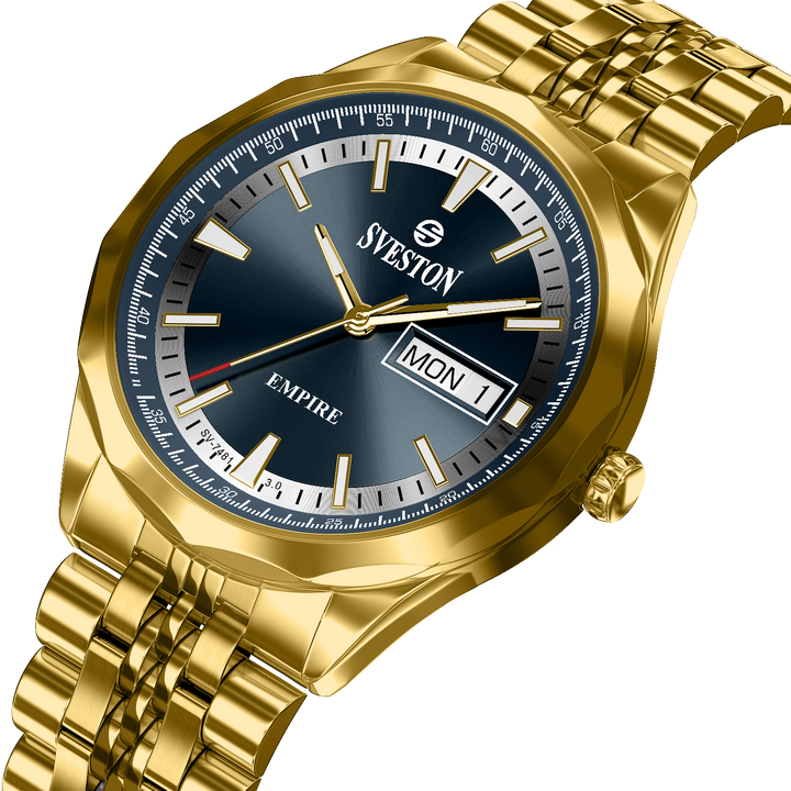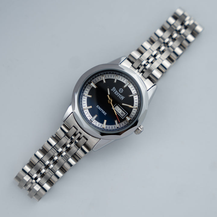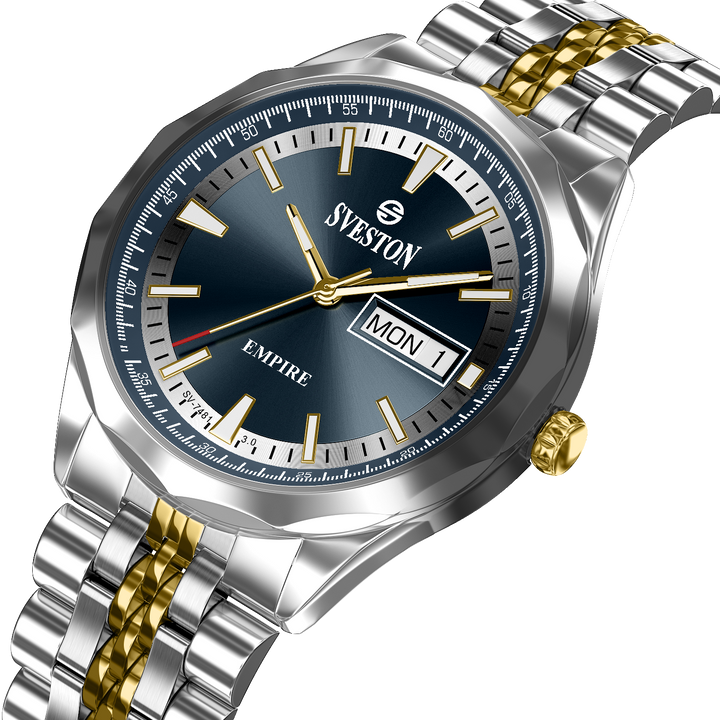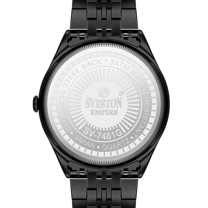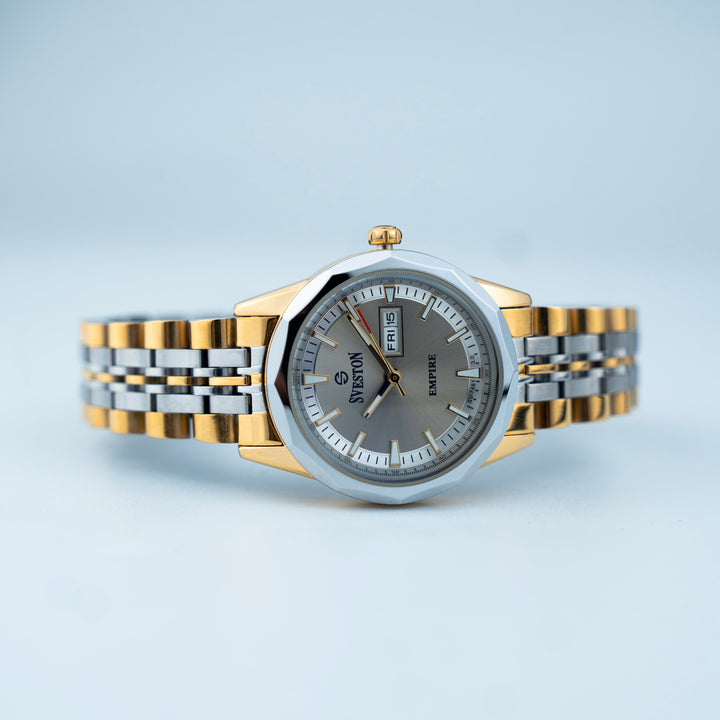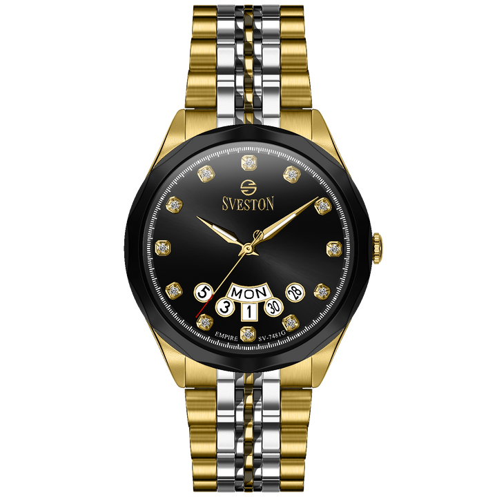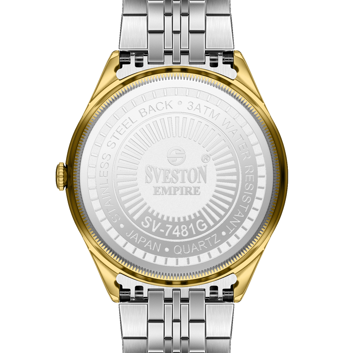 Sveston Empire is a Female Battery-Powered 3-Hand Wrist Watch showcases a sophisticated design with a 28mm round case, complemented by a Link Stainless Steel featuring a Butterfly Deployment Clasp It offers essential functionalities including hours minutes small seconds and a date window positioned on the right side this elegant timepiece comes packaged in a luxury box and includes a 1-year international warranty for added assurance