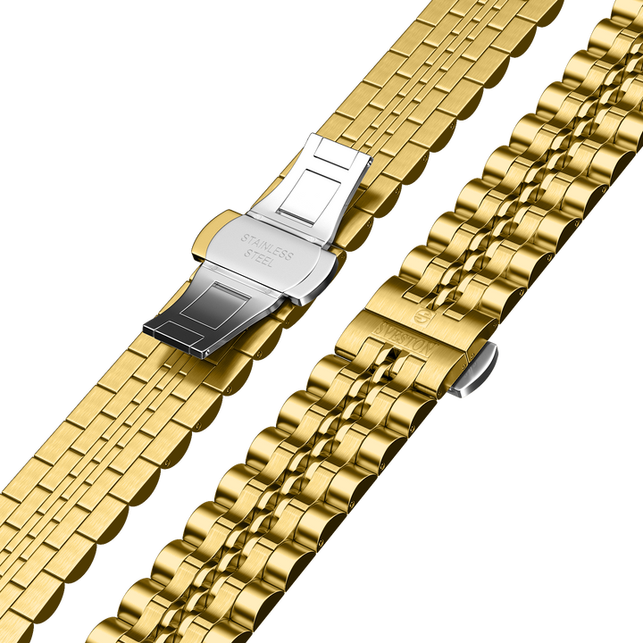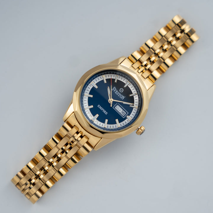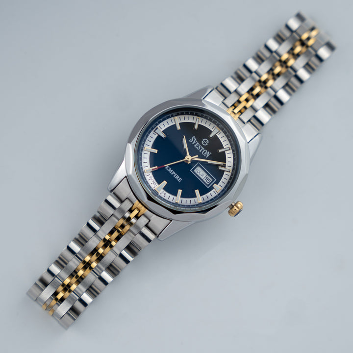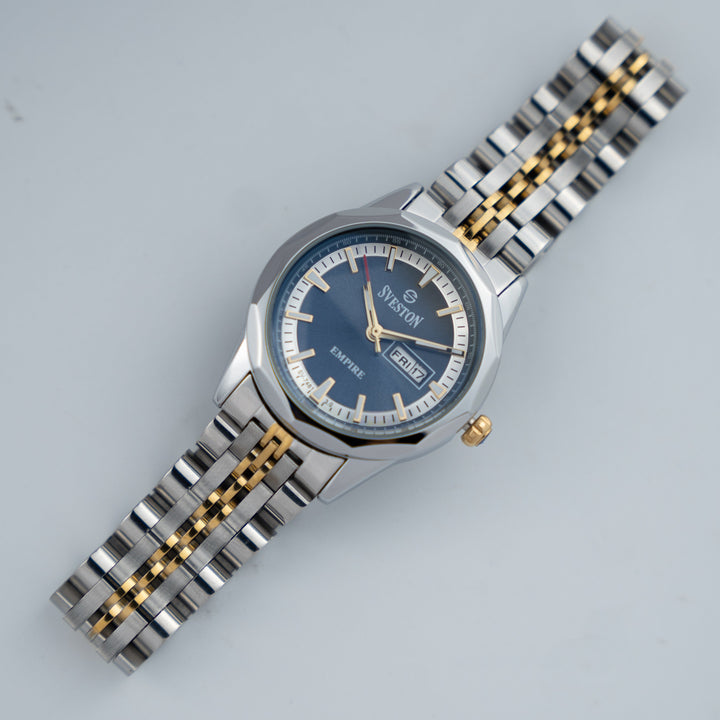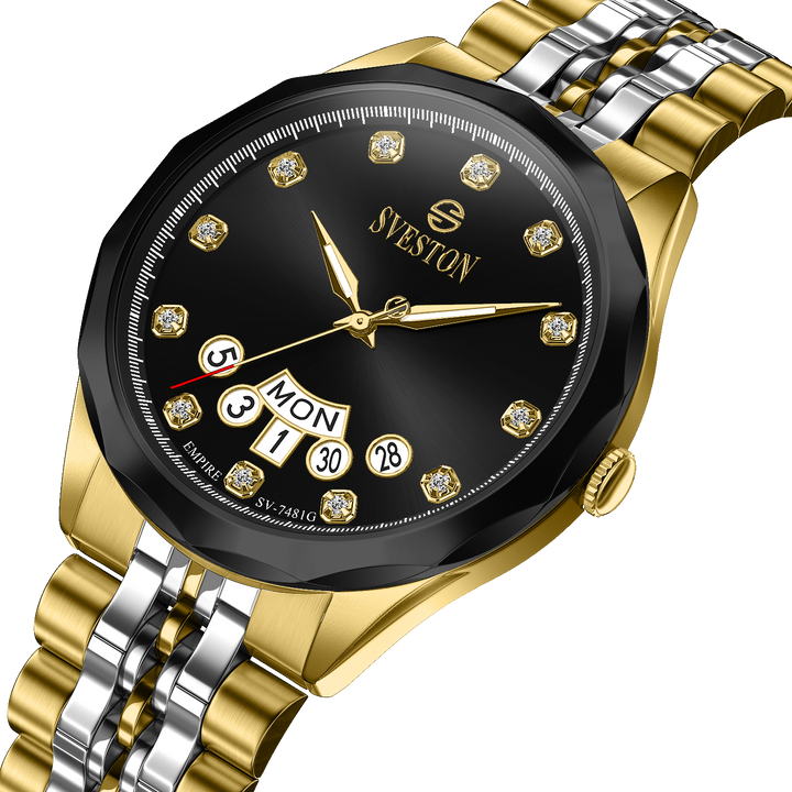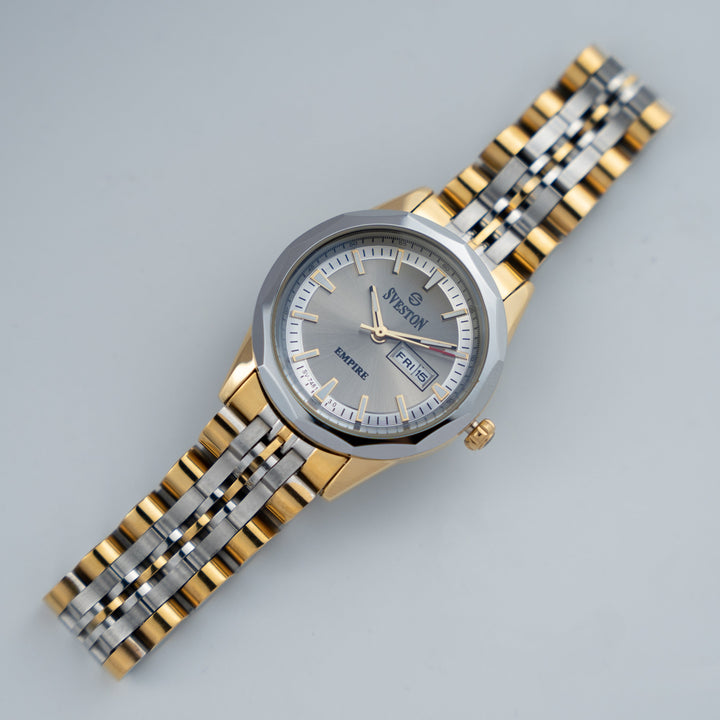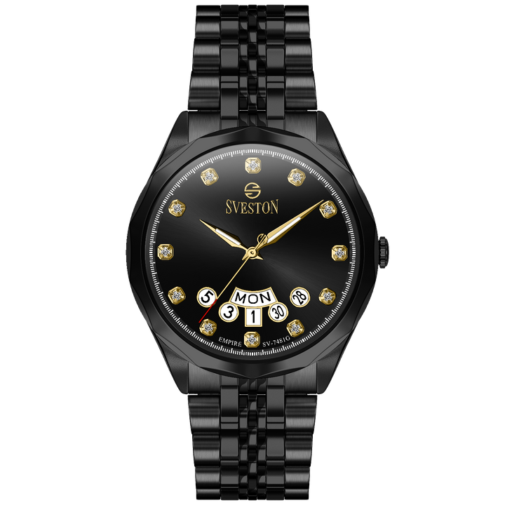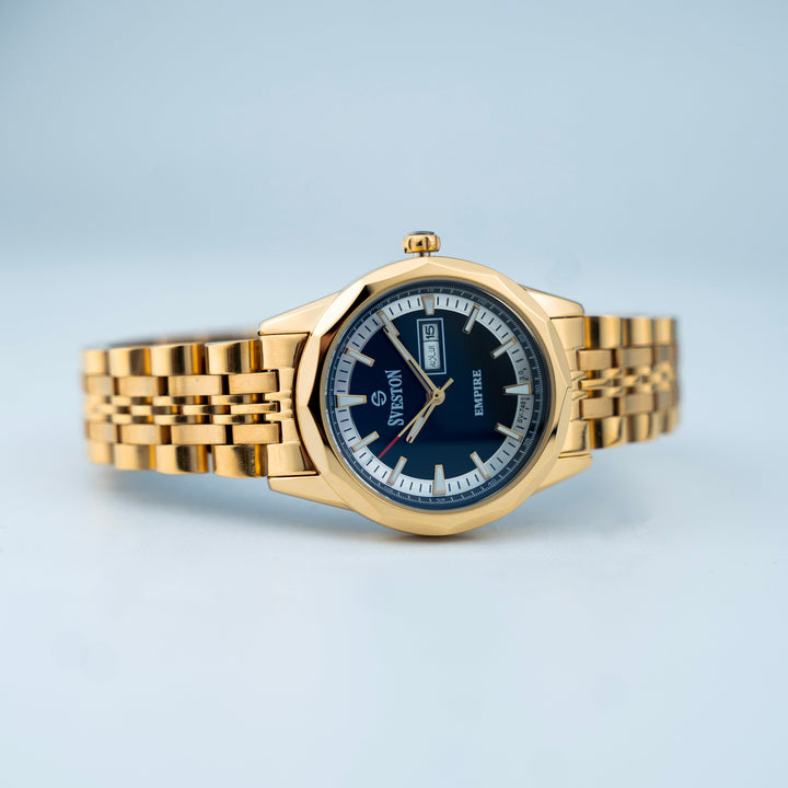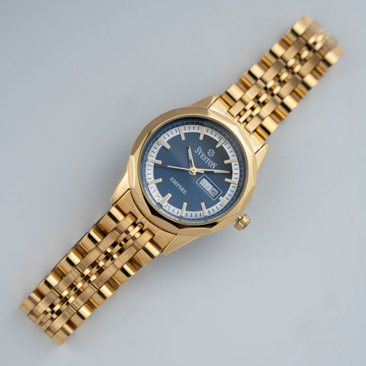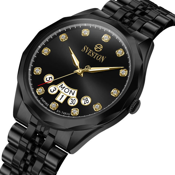 Sveston Empire is a Female Battery-Powered 3-Hand Wrist Watch showcases a sophisticated design with a 28mm round case, complemented by a Link Stainless Steel featuring a Butterfly Deployment Clasp It offers essential functionalities including hours minutes small seconds and a date window positioned on the right side this elegant timepiece comes packaged in a luxury box and includes a 1-year international warranty for added assurance
