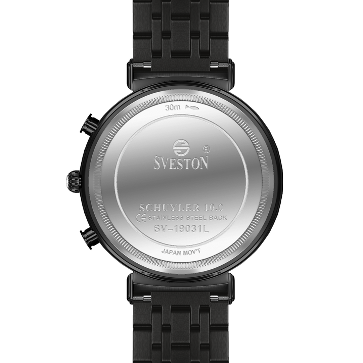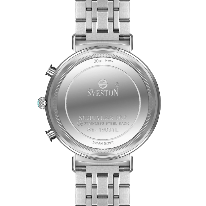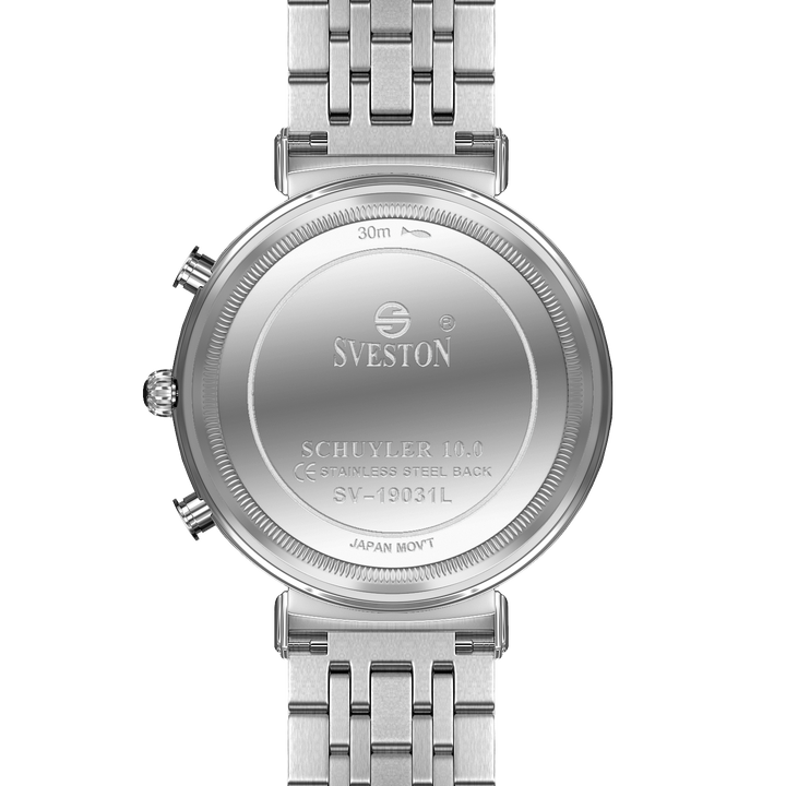 Sveston schuyler Analog battery powered 3 hand wrist watch, features a 31 mm round case on a Link Stainless steel with Fold-over Deployment Clasp. Functions include hours, minutes small seconds. This watch comes complete with luxury box and 1 year international warranty.