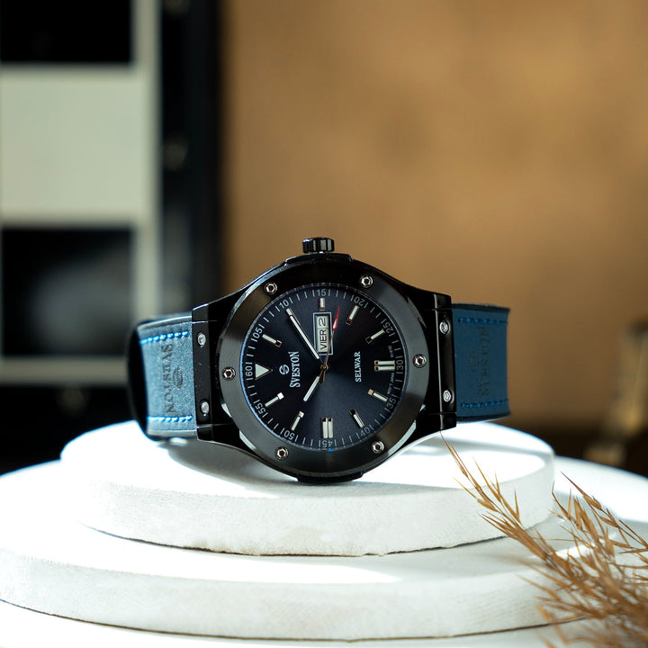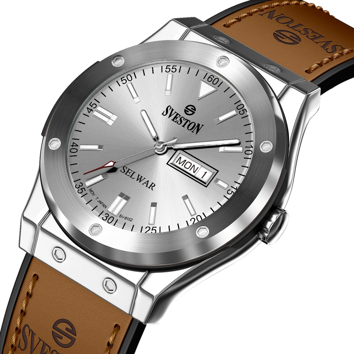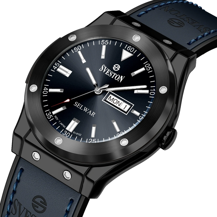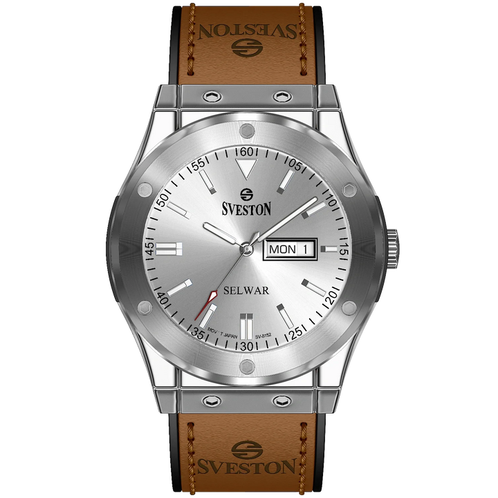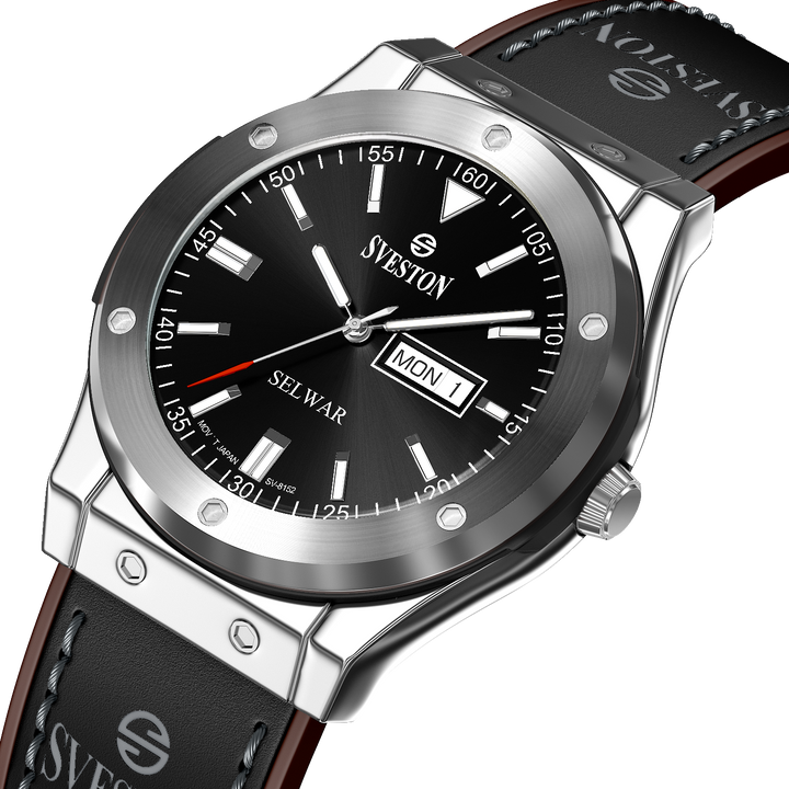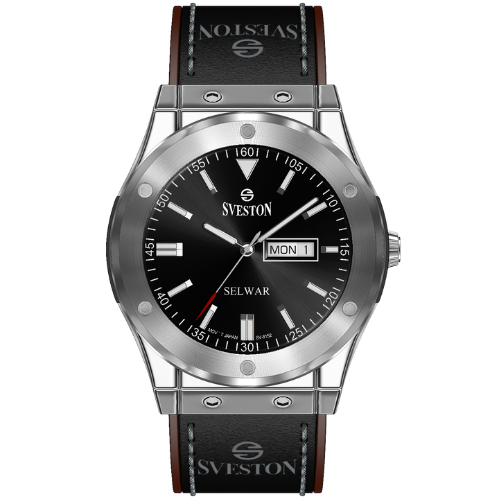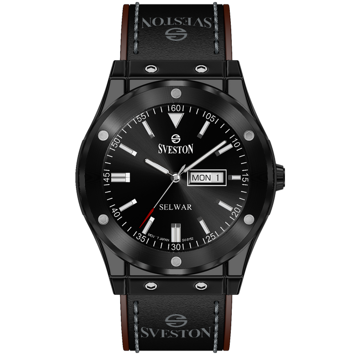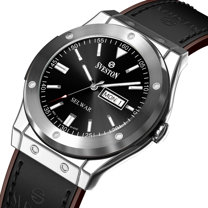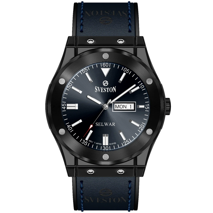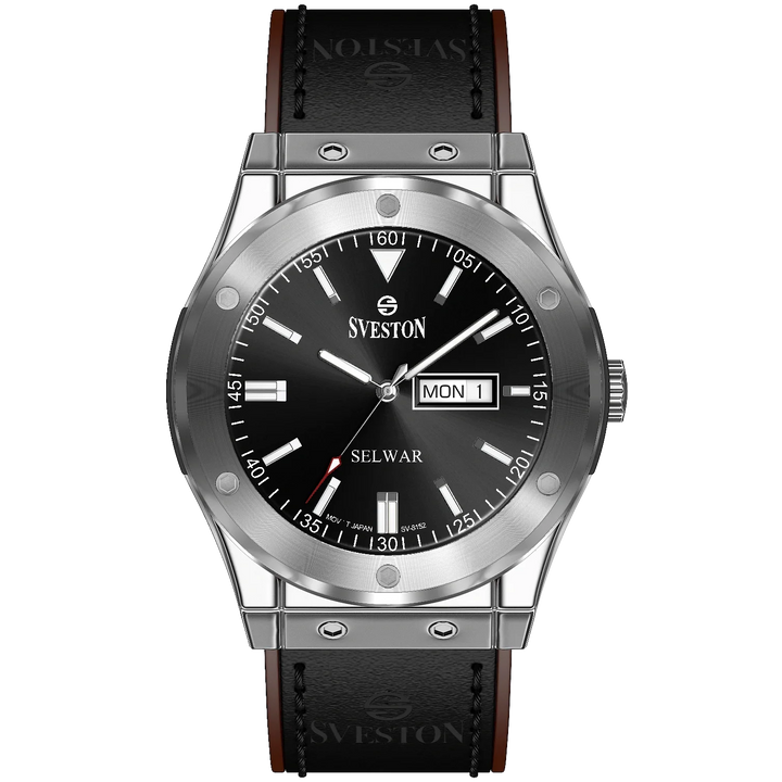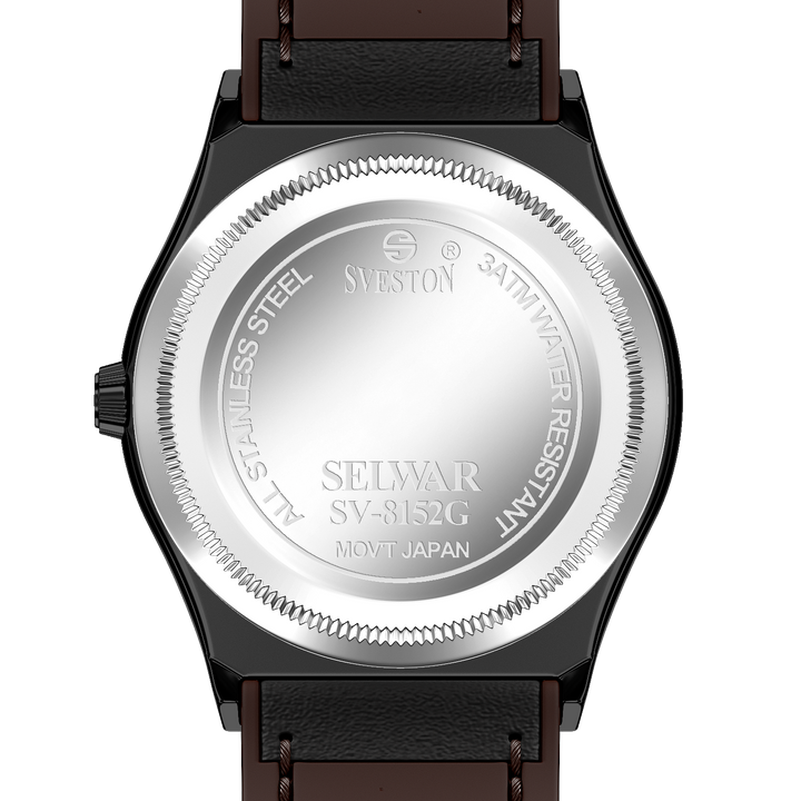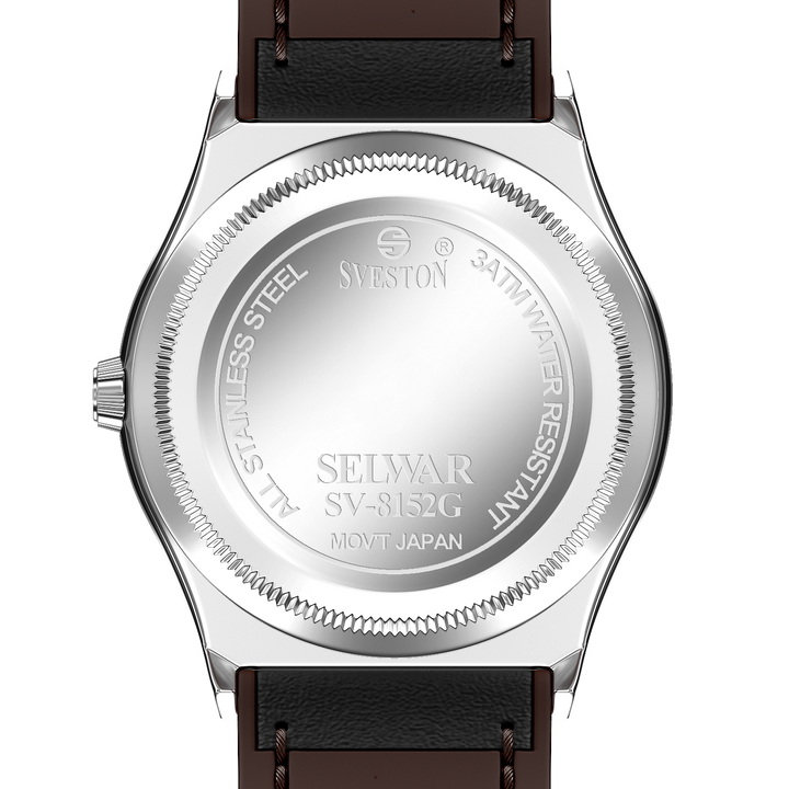Selwar a men's watch designed with Japanese Quartz movement featuring a 40mm case and a 48mm lug-to-lug distance for a comfortable fit at 89 grams its design allows for all-day comfort the 3ATM water resistance adds functionality to its sophisticated style