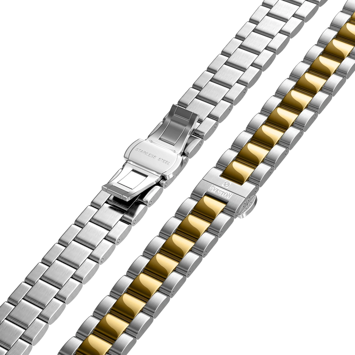 Sveston Siren is a stylish analog battery-powered 3-hand wristwatch featuring a 31mm round case, complemented by a link stainless steel bracelet with a fold-over deployment clasp. The watch includes functions for hours, minutes, and small seconds. It comes packaged in a luxury box and includes a 1-year international warranty.