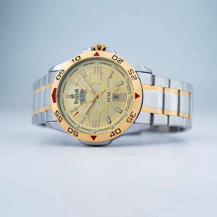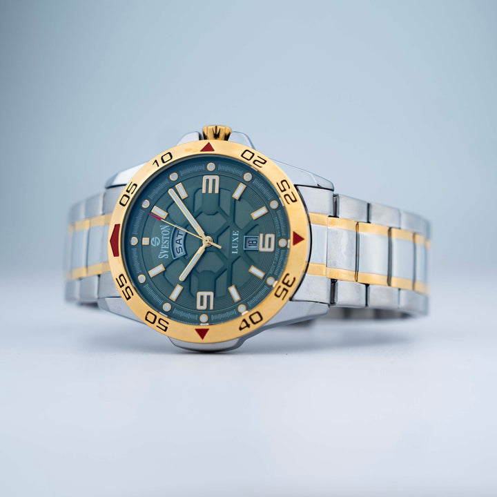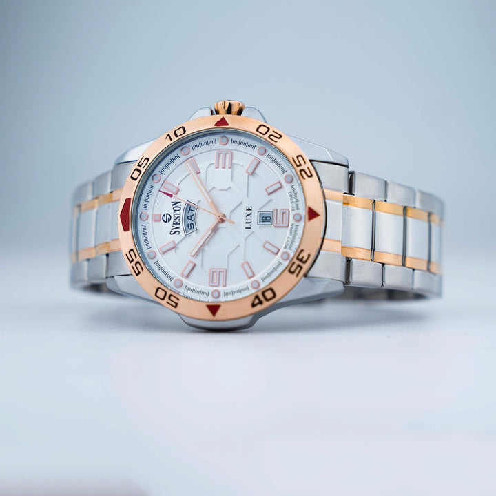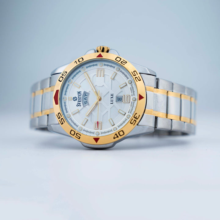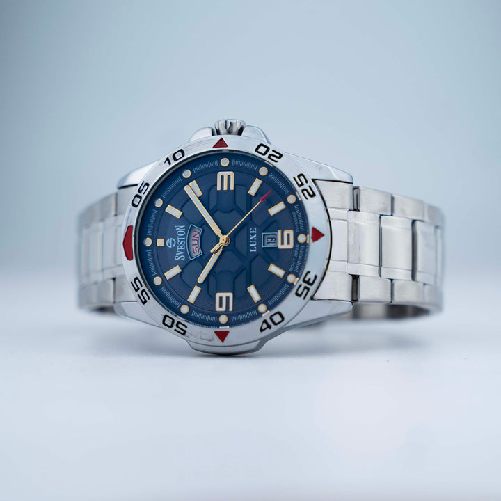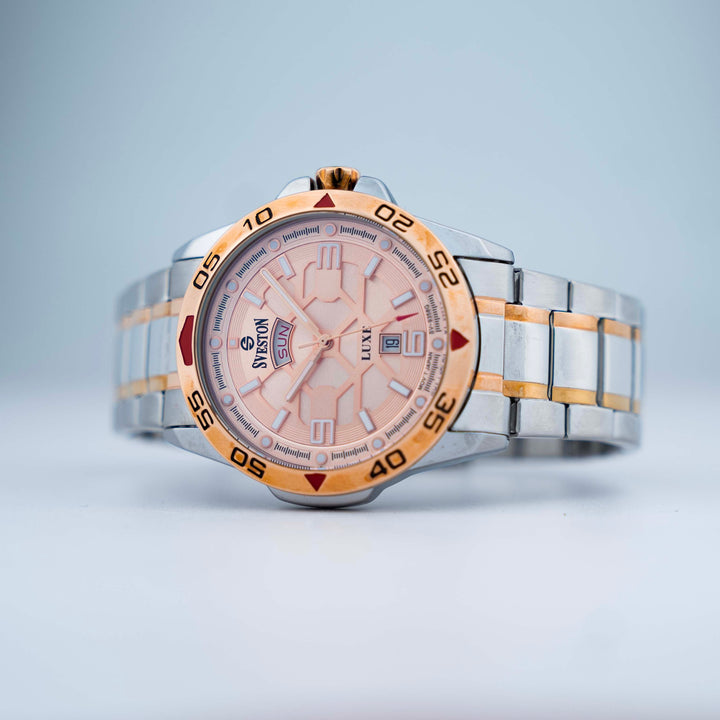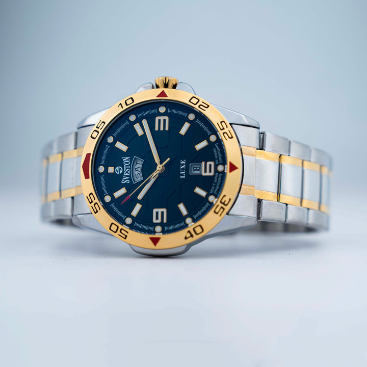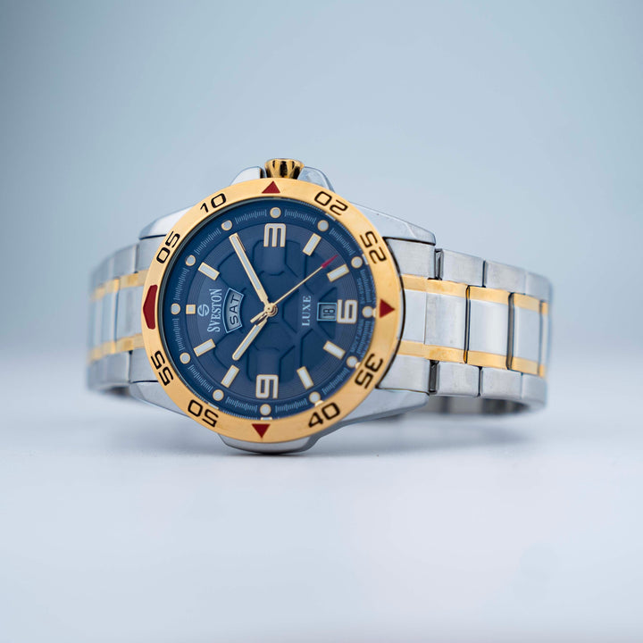 Sveston Luxe is a gents' stainless-steel watch featuring a 39mm dial and a stainless steel watch case with dual time functionality