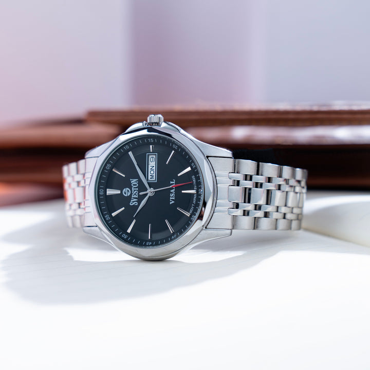 Visaal, a sophisticated stainless steel watch for men featuring Japanese quartz movement. With a 36mm case size and 45mm lug-to-lug distance, it's a perfect fit for any wrist. Weighing in at 124 grams, this timepiece is both durable and comfortable. 3ATM water resistance ensures it can withstand splashes and light rain. Get yours now and elevate your style game!
