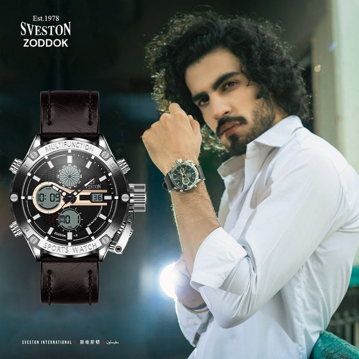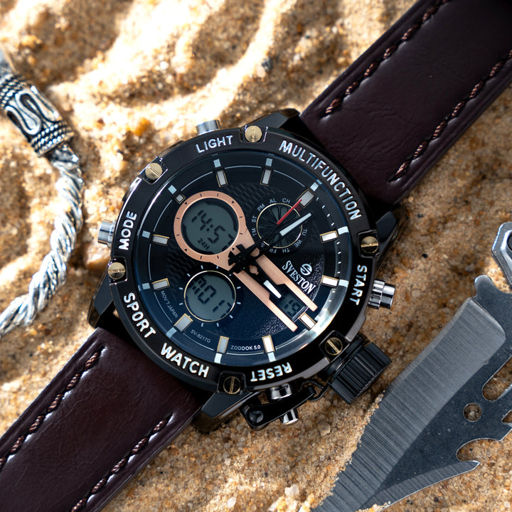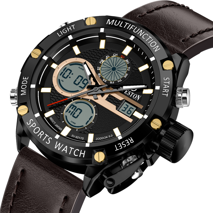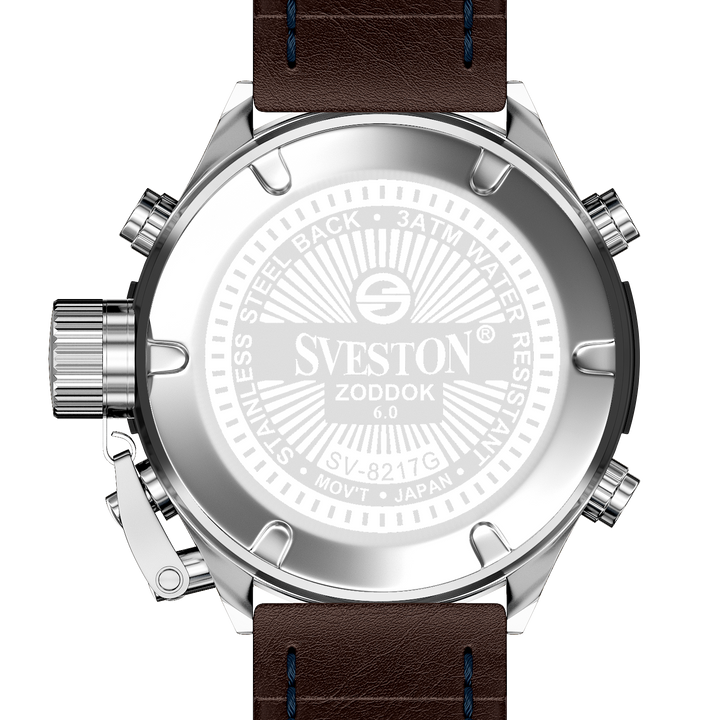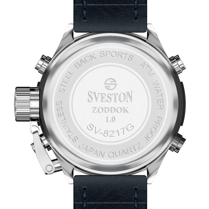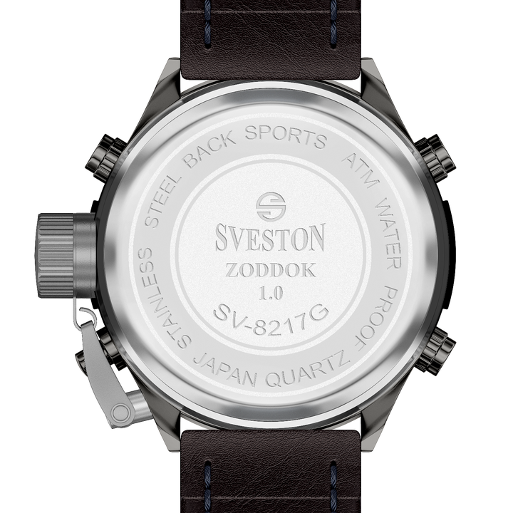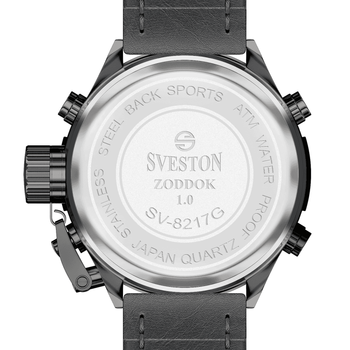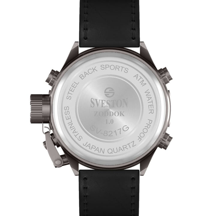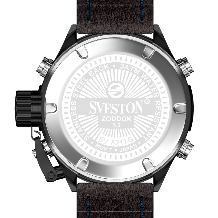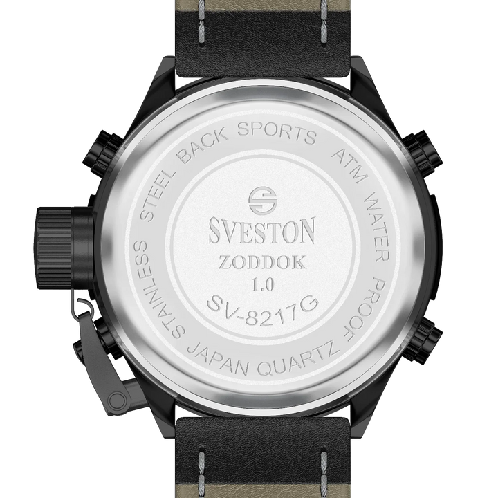 The Sveston Zoddok stands out with its oversized 44mm dial and genuine leather strap, making a powerful style statement. Comes encased in a luxury presentation box