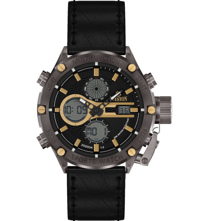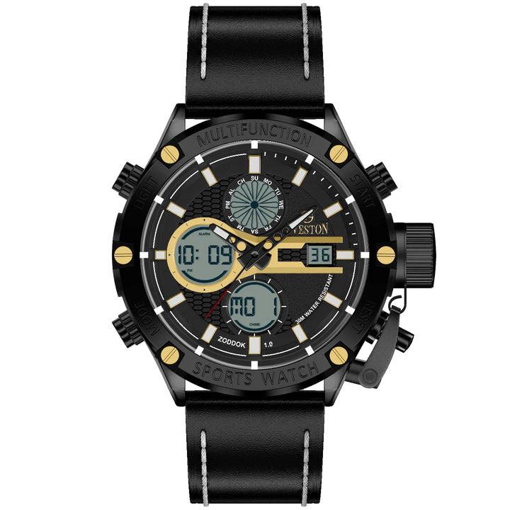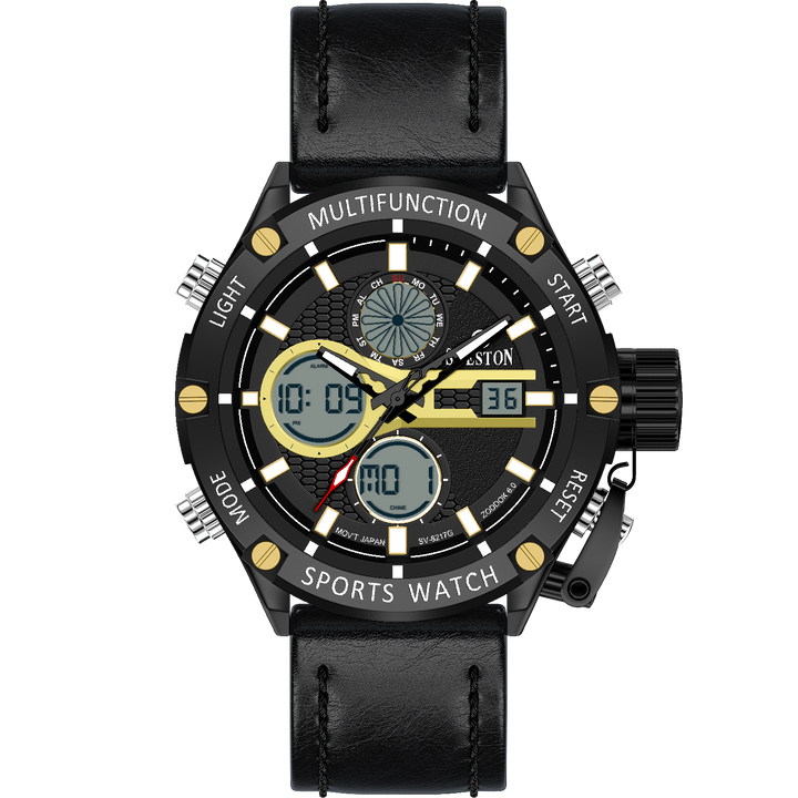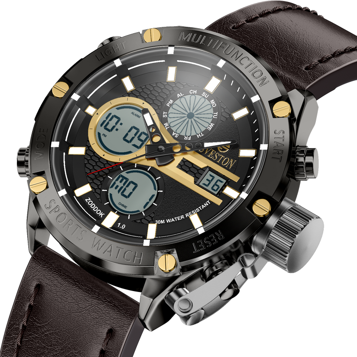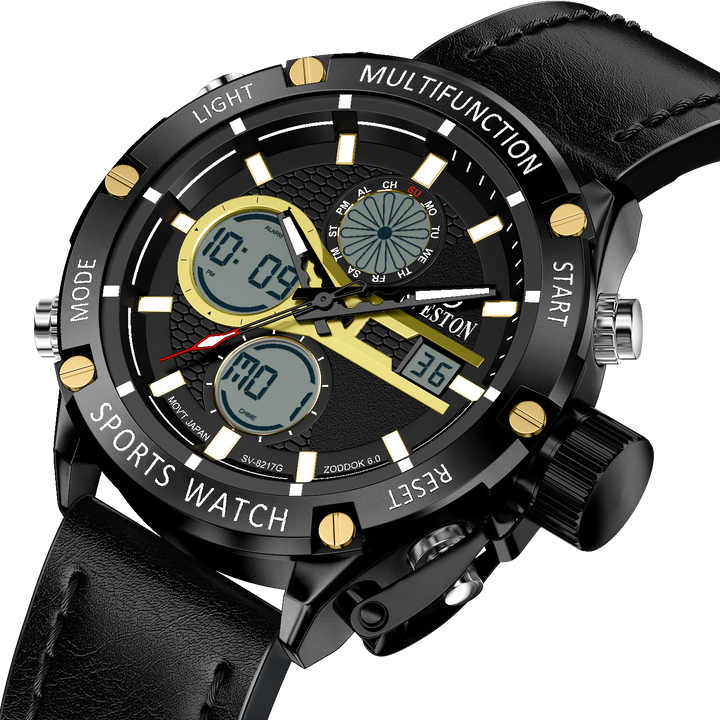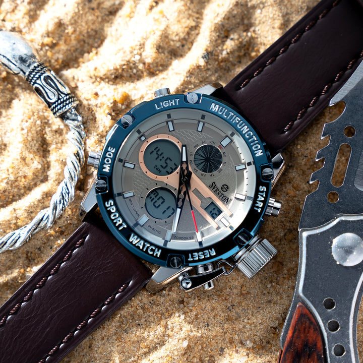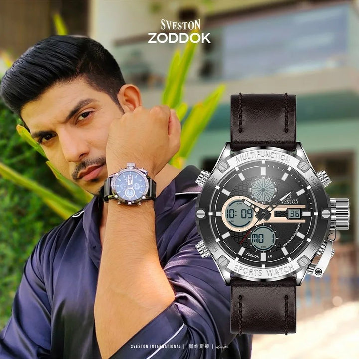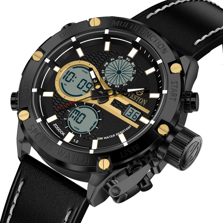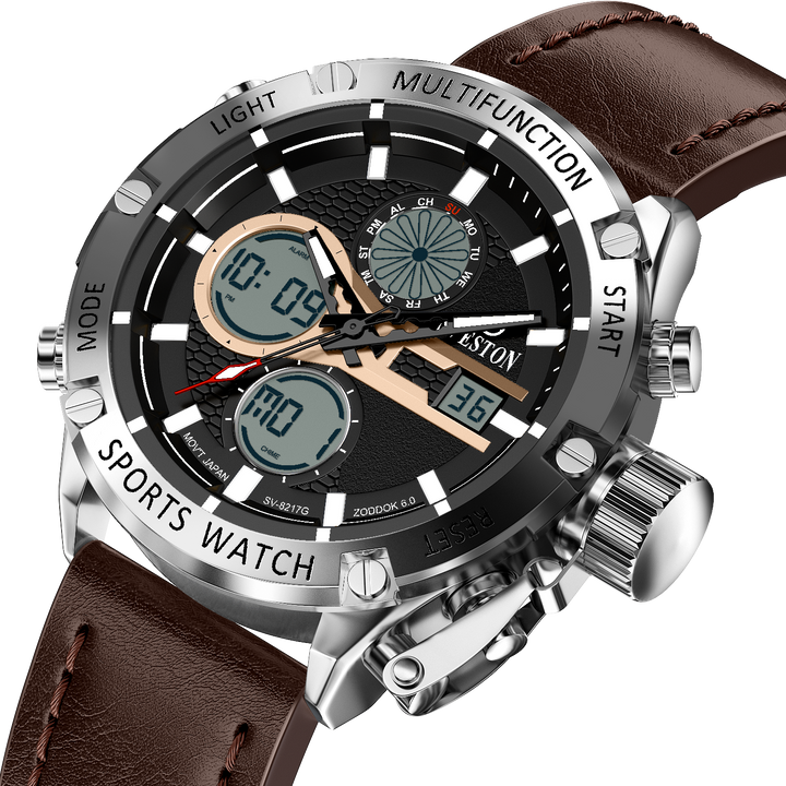 The Sveston Zoddok stands out with its oversized 44mm dial and genuine leather strap, making a powerful style statement. Comes encased in a luxury presentation box