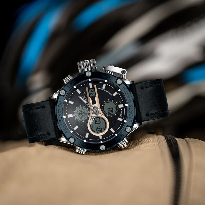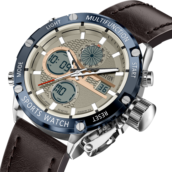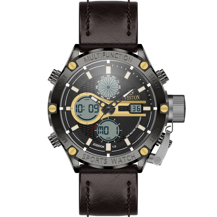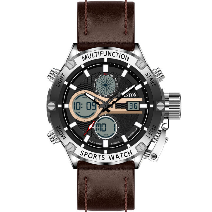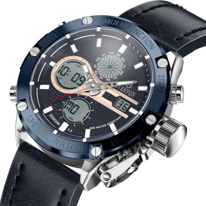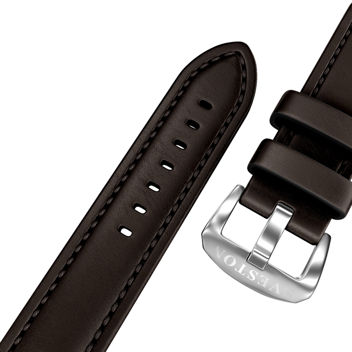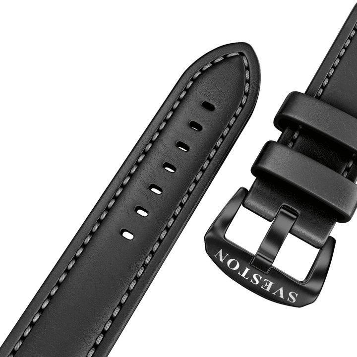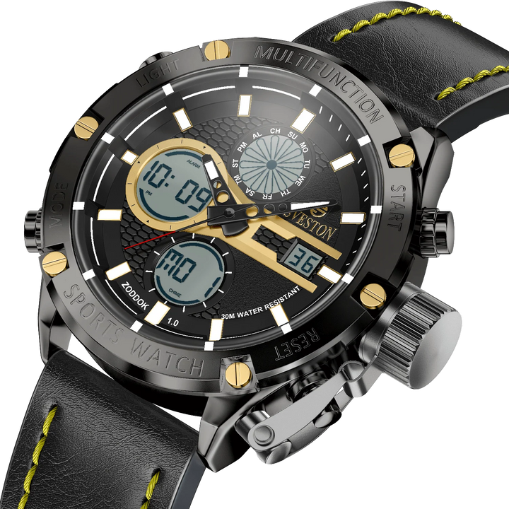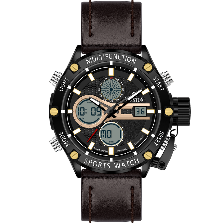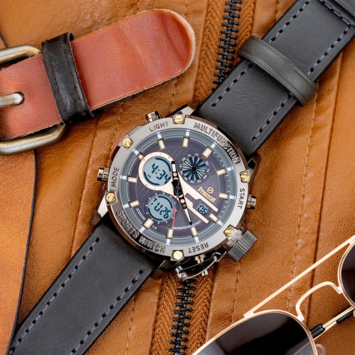 The Sveston Zoddok stands out with its oversized 44mm dial and genuine leather strap, making a powerful style statement. Comes encased in a luxury presentation box